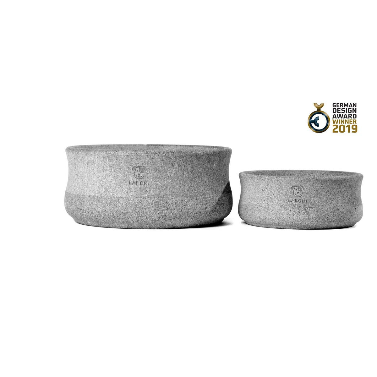 ROCKY - Edel-Napf für Hund und Katze Selbstkühlender Trink- und Futternapf, handgefertigt aus Naturstein Pure Natur in prämiertem Design bietet der Haustiernapf ROCKY von LABONI aus Milliarden Jahren altem Speckstein. Echte Zusatznutzen gewährleisten die natürliche Kühlfunktion sowie die besondere Pflegeleichtigkeit. Für Futter und Wasser, für Indoor & Outdoor! Mit ROCKY hat LABONI ein Designobjekt geschaffen, das höchsten Ansprüchen gerecht wird und Indoor wie Outdoor archaische Schönheit mit praktischem Nutzen verbindet. Der Haustiernapf ist in einem Stück aus finnischem Speckstein gearbeitet und erscheint in einem reduzierten, formal klaren Design. Die einzigartige Kühlfunktion hält Futter und Wasser lange frisch und animiert Ihre Vierbeiner zum Trinken. Das reine Naturprodukt ist lebensmittelecht und somit auch für Allergiker geeignet. Durch hohes Eigengewicht bleibt der Napf von LABONI am Platz, sodass Ihre Fellnase nicht geräuschvoll auf Wanderschaft gehen kann. Wie eine natürliche Antihaft-Beschichtung ist die Oberfläche Schmutz- und Bakterien abweisend und ROCKY dadurch besonders pflegeleicht: Kurzes Ausspülen genügt – oder einfach in der Spülmaschine reinigen. Ein weiterer Vorteil des einzigartigen Gesteins: Das Material gibt keinen unangenehmen Beigeschmack ab, wie es oft bei Metall- und Plastiknäpfen der Fall ist. Mit diesem einzigartigen Trink- und Futternapf entscheiden Sie sich für ein echtes Unikat und beweisen gleich doppelt guten Geschmack: ästhetisch & funktional! Ihr Vierbeiner hat es verdient! Vorteile Gesundheitsfördernd & sicher 100 % Natur - regt zum Trinken an, gibt keinen Beigeschmack an Lebensmittelecht, antibakteriell ideal für Hunde mit Kontaktallergien Einzigartige Kühlfunktion natürliche Kühleigenschaft und Frischhaltefunktion kaltes Wasser einfüllen - Speckstein speichert die Temperatur zur Erwärmung von Nassfutter Napf einfach vorher unter warmem Wasser Pflegeleicht & komfortabel für Futter und Wasser, für drinnen und draußen spülmaschinenfest, natürliche Antihaftbeschichtung standfest, verrutscht nicht – durch hohes Eigengewicht Geprüfte Qualität & mehrfach prämiertes Design Massiv und von Hand verarbeitet jeder Napf ein Unikat – aus 2 Milliarden Jahren altem Speckstein German Design Award Gewinner 2019, IDA International Design Awards Gewinner Gold Eigenschaften Größen: S:500 ml, 14 x 14 x 6 cm, 1,2 kg, L:1500 ml, 20 x 20 x 9 cm, 2,7 kg Material: Finnischer Speckstein, lebensmittelecht Pflegehinweis: natürliche Antihafteigenschaft, spülmaschinenfest Hinweis: Unsere Kollektionen werden von Hand gefertigt und bestehen aus Naturmaterialien, daher sind Abweichungen in Farbe, Struktur und Grösse möglich. Dies macht den individuellen Charme unserer Designprodukte aus. Bitte haben Sie Verständnis dafür, dass die Angaben und Bilder auf unserer Webseite daher nicht immer exakt das von Ihnen gewählte Produkt widergeben können. Pressestimmen Jury des Deutschen Designpreises:Der ökologische und praktische Hundenapf ROCKY überzeugt durch seine archetypische Form und Funktionalität. Durch die Verwendung von Speckstein ist das Produkt langlebig und stabil. Darüber hinaus bietet das Material neben seiner Wasserundurchlässigkeit weitere vorteilhafte Eigenschaften. HARBOR Magazine: Mit der Napfkollektion ROCKY hat LABONI ein Designobjekt geschaffen, das höchsten Ansprüchen an Ästhetik und Funktionalität gerecht wird. FEEL GOOD Magazine: Markenzeichen der unkonventionellen Schweizer Kreativschmiede sind besondere Funktionalität, Design und höchster Komfort gepaart mit einem eleganten Sinn für Humor und einem Gespür dafür, was Hund und Halter Freude wirklich vorbereitet hat.